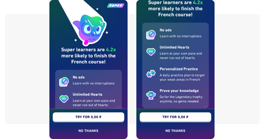 Throughout the onboarding process, the app engages users by recommending a brief level-assessment test. By skipping basic units and guiding users towards more advanced stages, the app increases motivation from the outset, enhancing the effectiveness of the further learning journey: