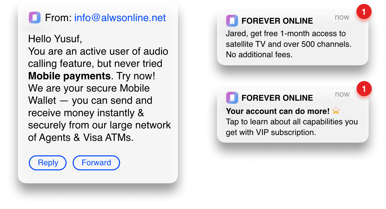 All of your user acquisition efforts are pointless if you cannot retain newcomers and keep them active. That’s where push notifications and emails come to the rescue. These communication channels are highly effective for user retention and preventing churn.
