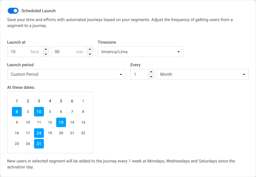 💡 In Pushwoosh, you can automate push notification reminders through flexible scheduling options. You can select among default or custom intervals as well as indicate specific dates:
