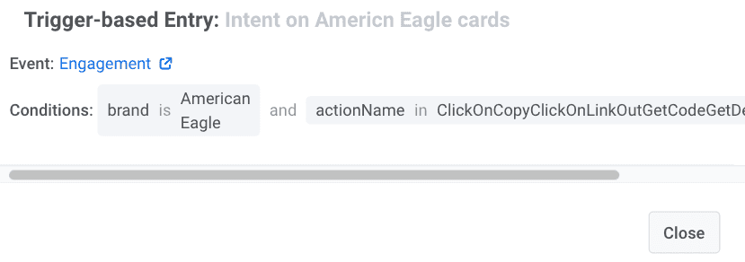 - Trigger-based entry: users enter the journey when they trigger the target Event with the specific Event attribute (for example, “brand: American Eagle”):