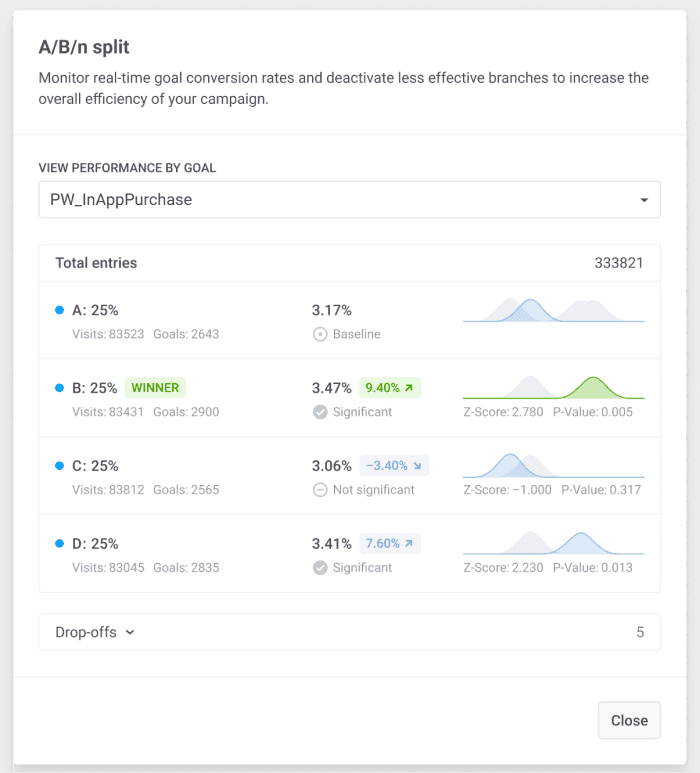- Completion of campaign goals. Marketers can analyze selected variations from the perspective of meeting campaign goals. These goals can include meaningful events in your app, such as any purchase-related events. With the A/B/n testing feature in Pushwoosh Customer Journey Builder, you can track goal conversion rates in real time.